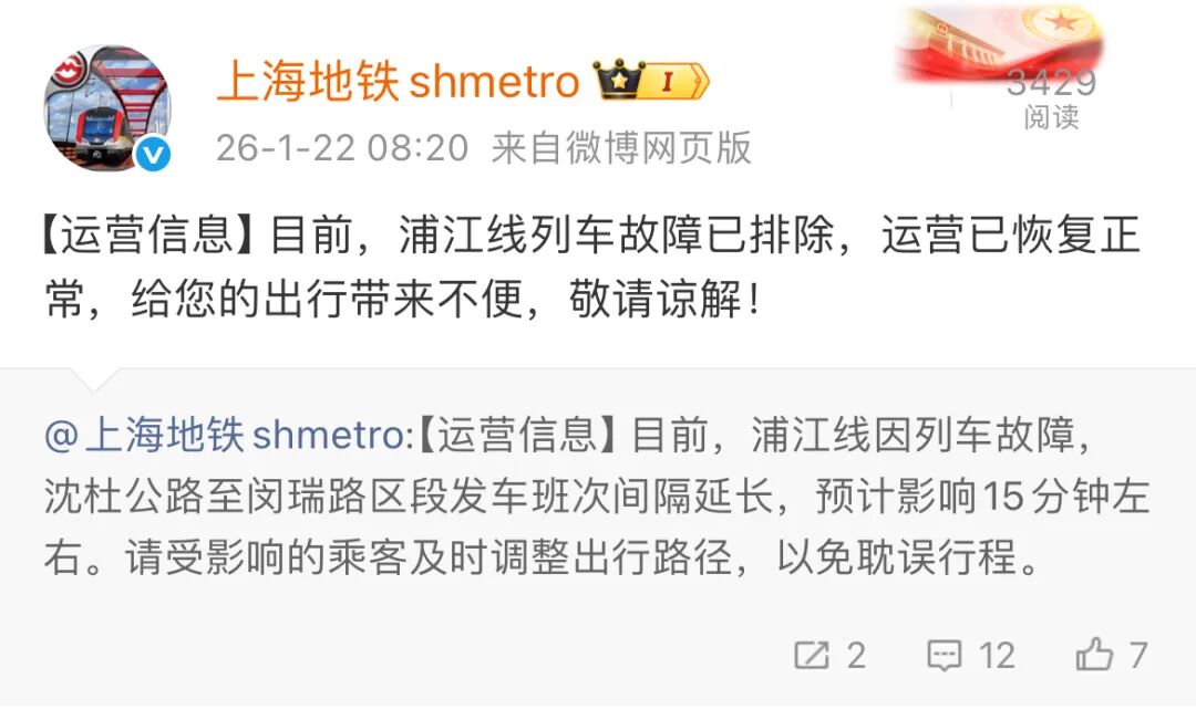 当今,浦江线列车故障已摒弃,运营已规复宽广,给您的出行带来未便,敬请关怀!